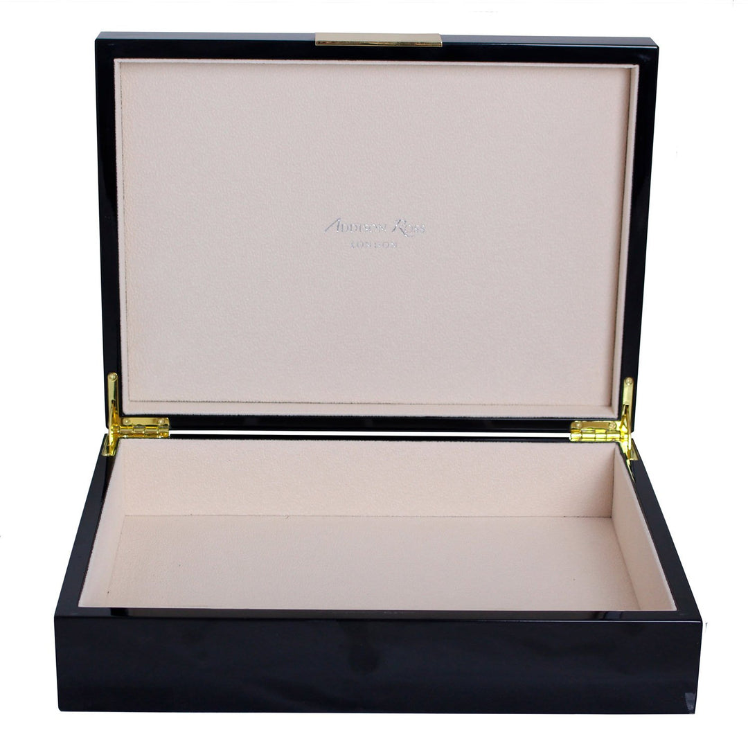 This sleek black storage box boasts a lustrous finish and a bright gold clasp with matching hinges. With a luxuriously soft suede interior, this piece is perfect for storing jewelry, watches, trinkets, and glasses.