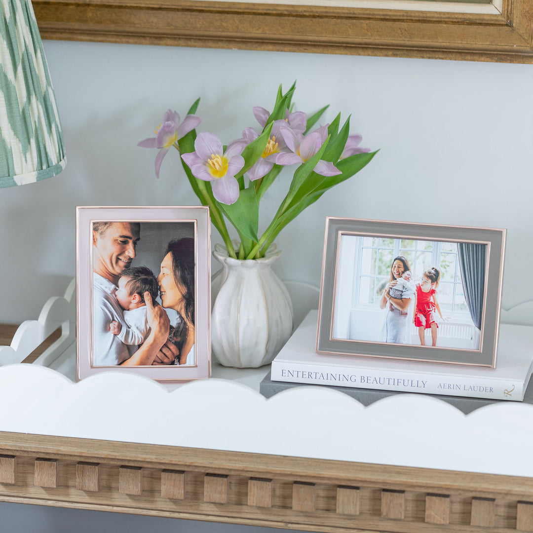This exclusive and unique rose gold with blush pink 20mm enamel frame comes beautifully tissue wrapped and gift boxed in our stunning branded packaging. This frame suits all interiors, simple and elegant a perfect gift for any occasion.