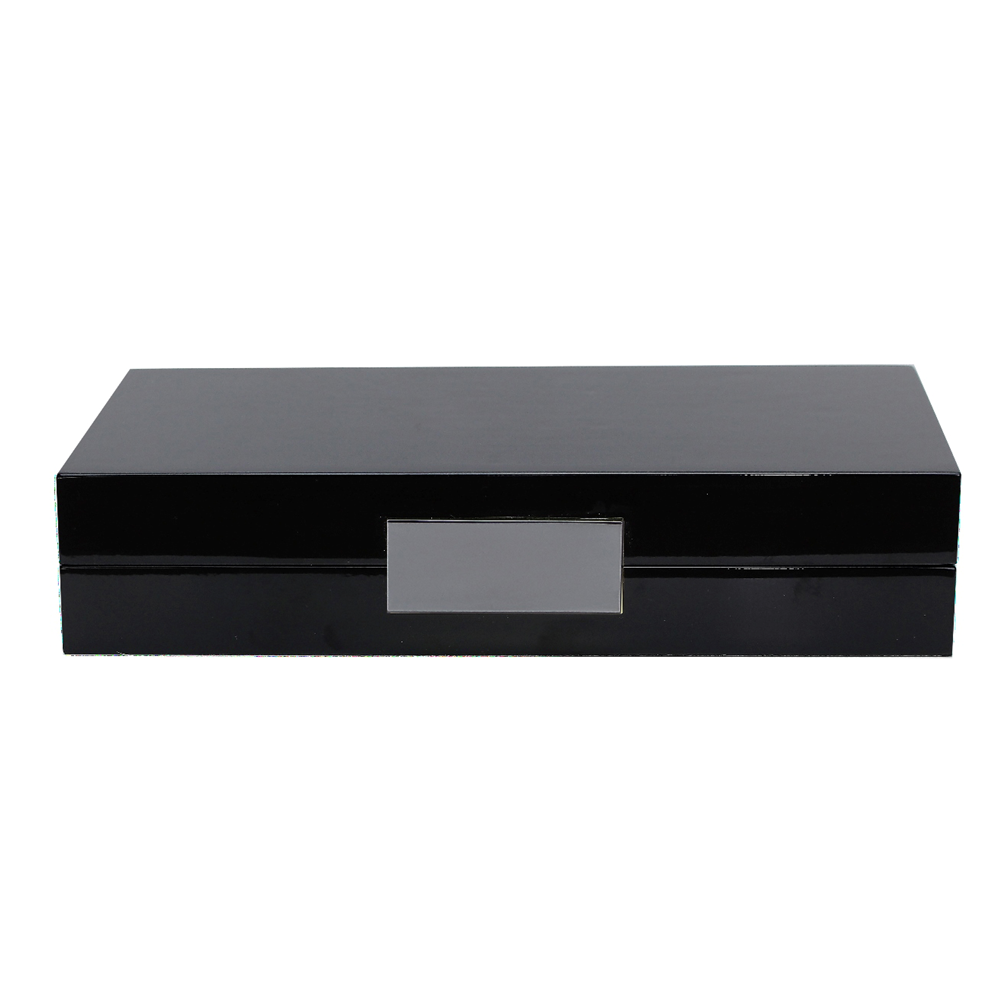 This beautiful lacquered Black Jewelry Box measures 4x9x2 inch and features a silver plated clasp and matching hinges. All of our boxes have had 20 coats of lustrous polished lacquer.