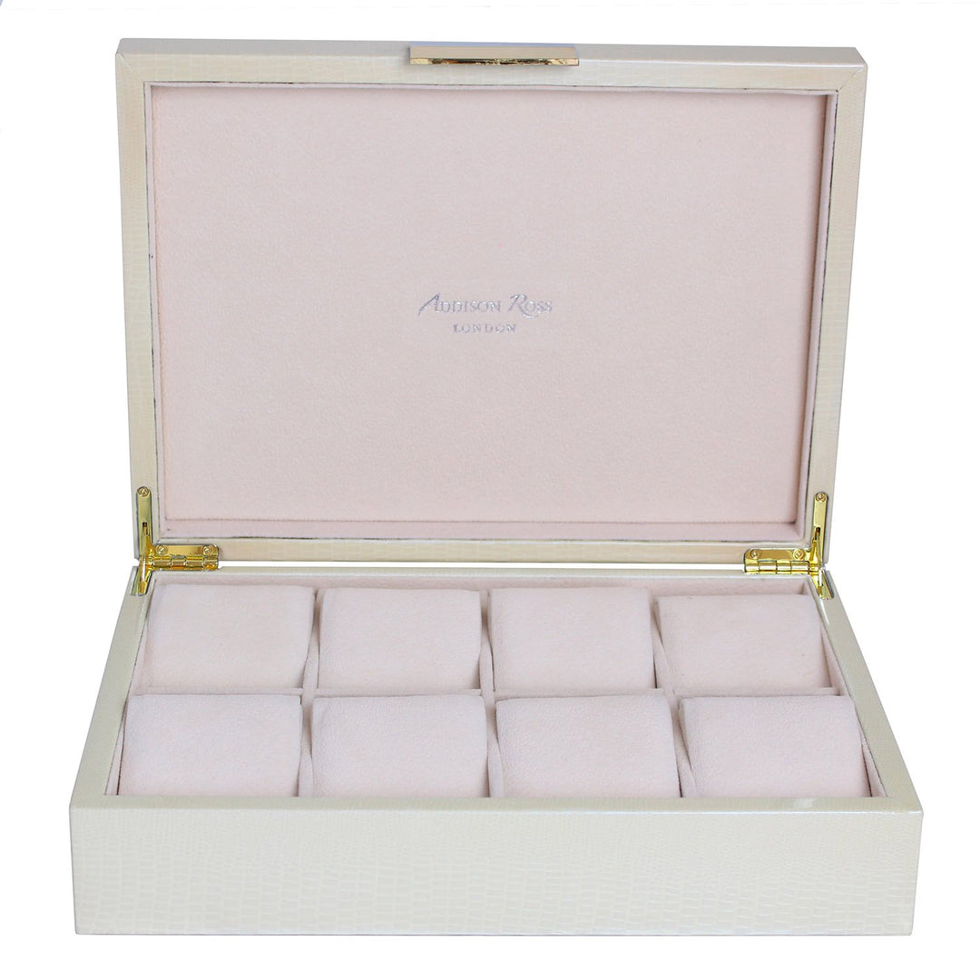 This stylish watch box boasts a polished crocodile effect finish and a bright gold clasp with matching hinges. The suede cushioned compartments can store and display up to 8 watches.