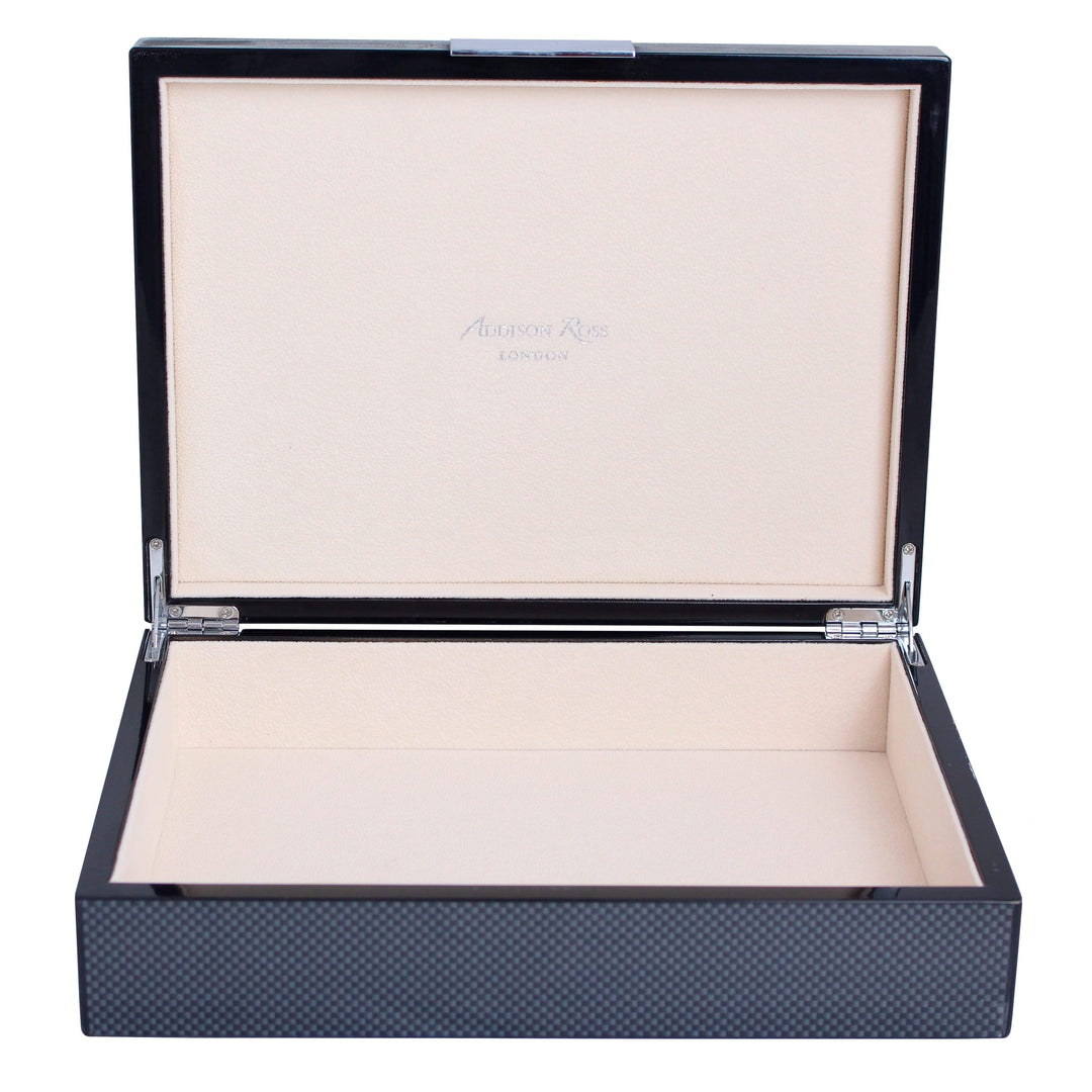 This unique carbon fibre storage box boasts a polished finish and a bright silver clasp with matching hinges. With a luxuriously soft suede interior, this piece is perfect for storing jewelry, watches, trinkets, and glasses.