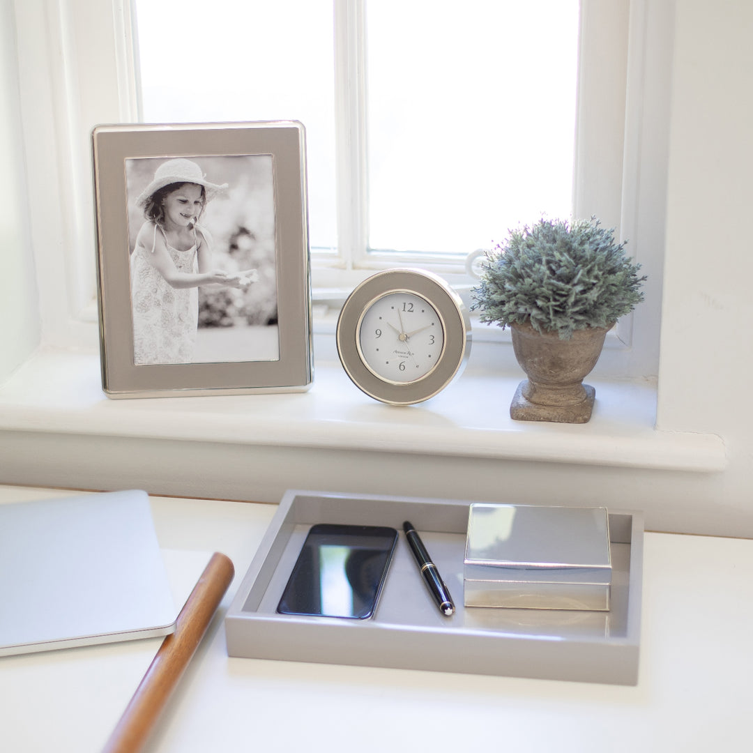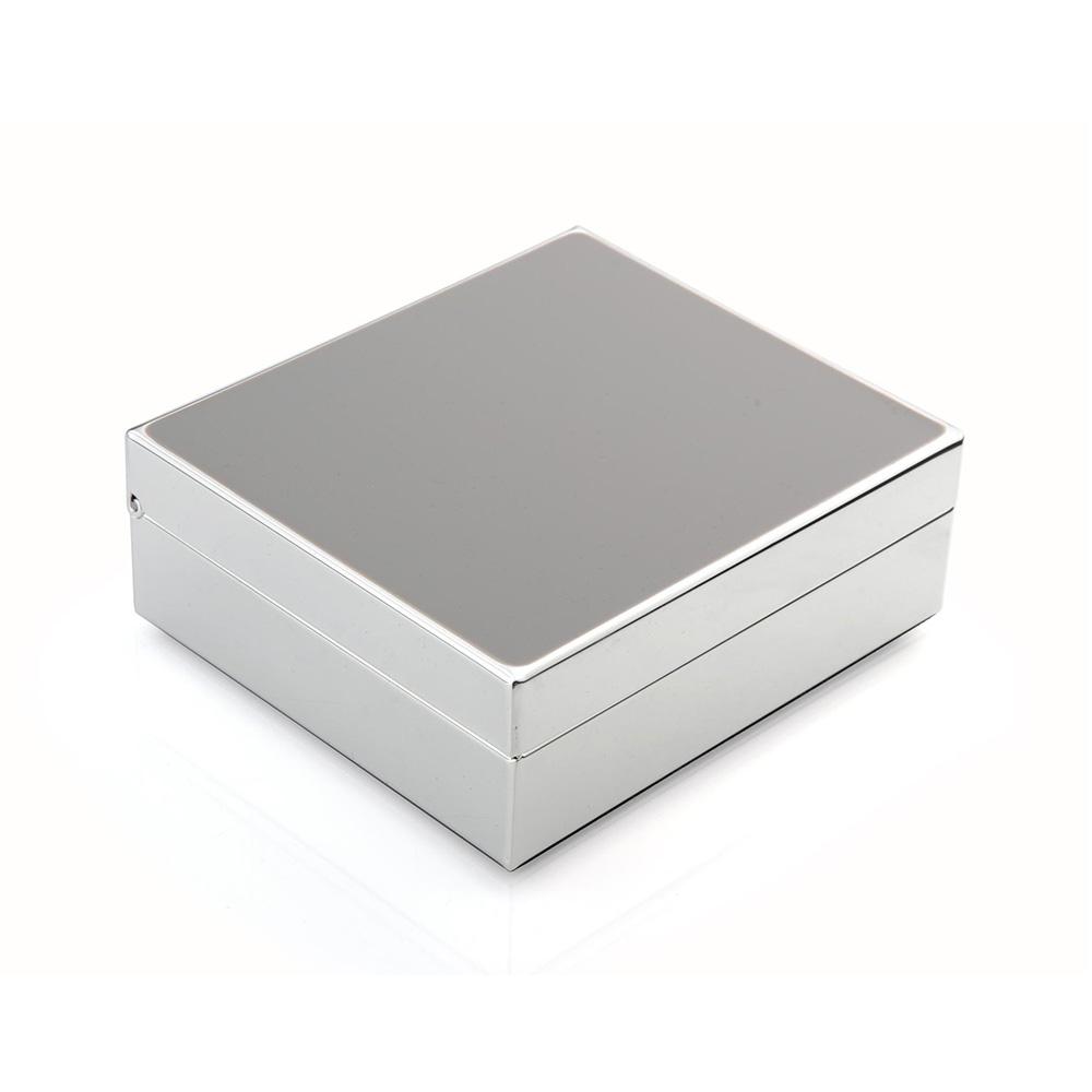 Beautifully finished this Chiffon Grey Enamel hinged box is finished with silver plate and lined with dove grey velvet. A perfect size for jewellery, cuff links or desk top bits and pieces.