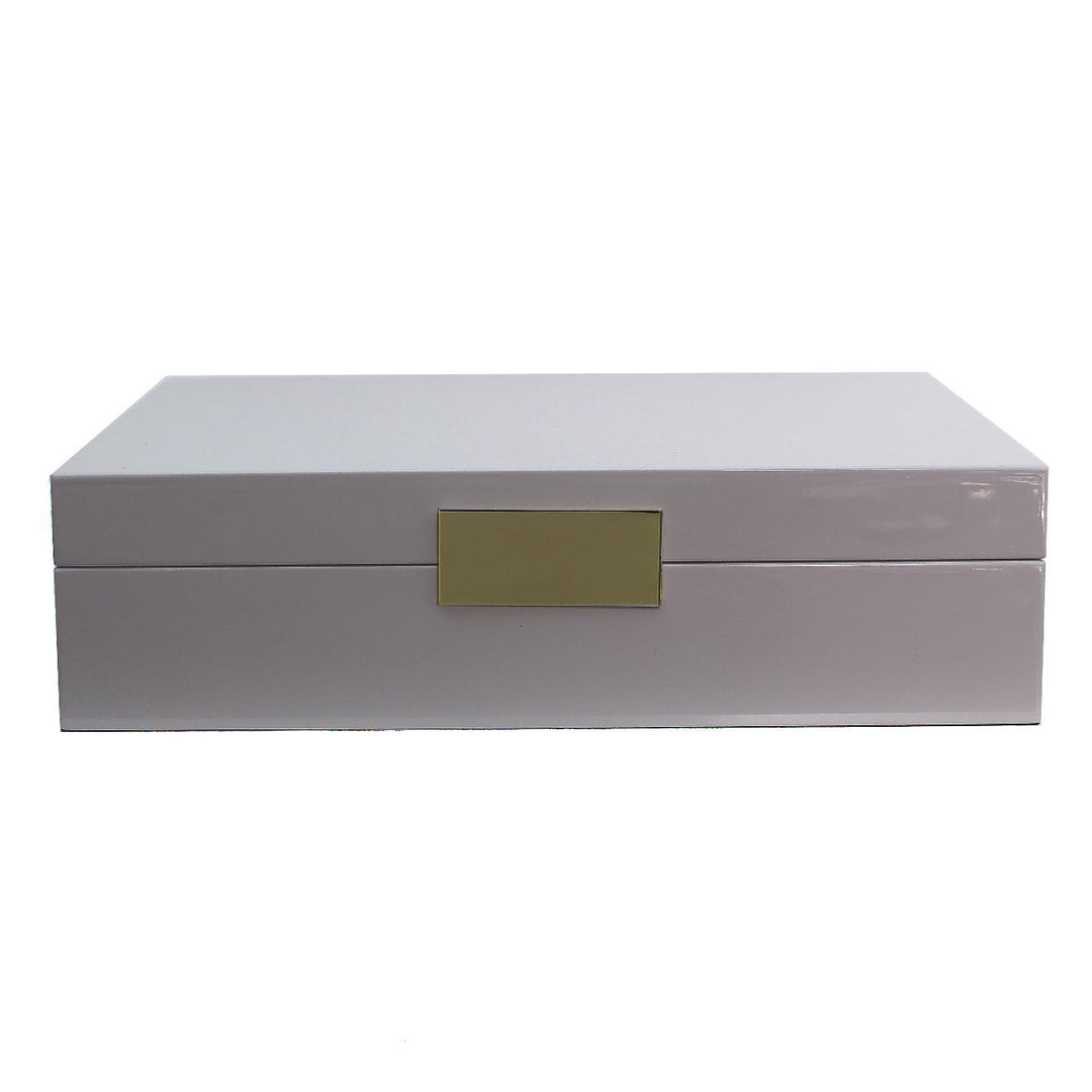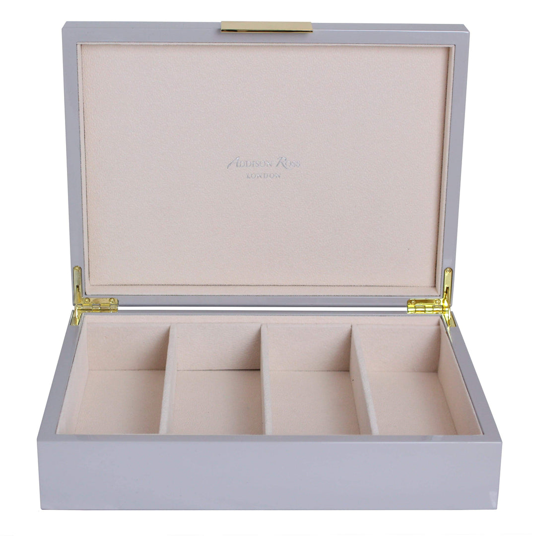 This lovely chiffon gray glasses box boasts a polished finish and a bright gold clasp with matching hinges. With a soft suede interior this piece can store 4 pairs of reading glasses or sunglasses .