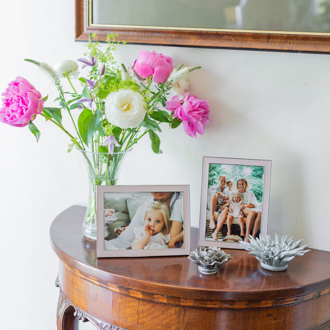 Our lovely light pink enamel picture frame finished with fine silver trim is a charming way to display special family photos. Complementing both classic and modern interior decor, this elegant enamel frame suits black and white or full color photographs.