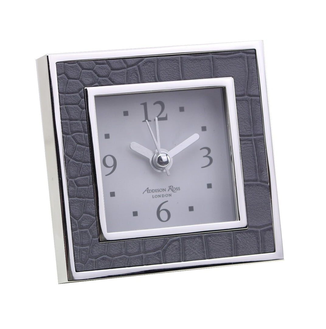 Our grey faux croc enamel square alarm clock beautifully complements our enamel frames, complete with an alarm function, this clock is ideal for a bedside table or desk. Backed in black velvet with a silver clock movement cover.