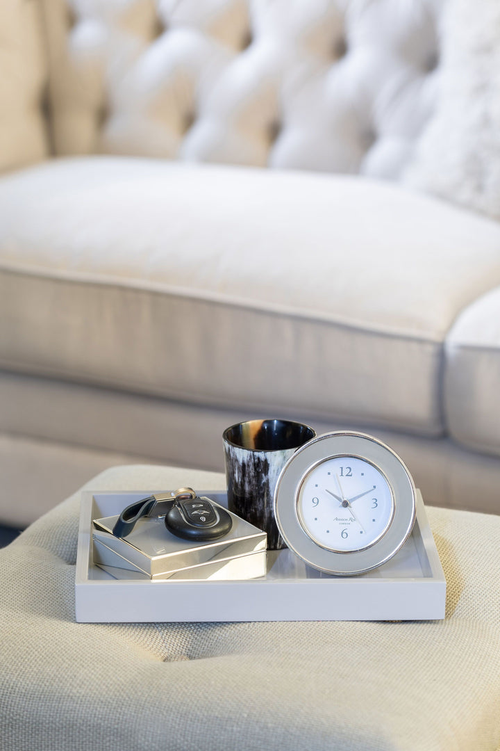 Our Lacquered Chiffon Grey Tray is finished with 20 coats of high gloss lacquer, hand polished between each coat, this lovely tray is perfect as a small tea for two tray (or of course glass of wine for two!) or alternatively it is a perfect display tray for bathroom, bedside, kitchen or desk.