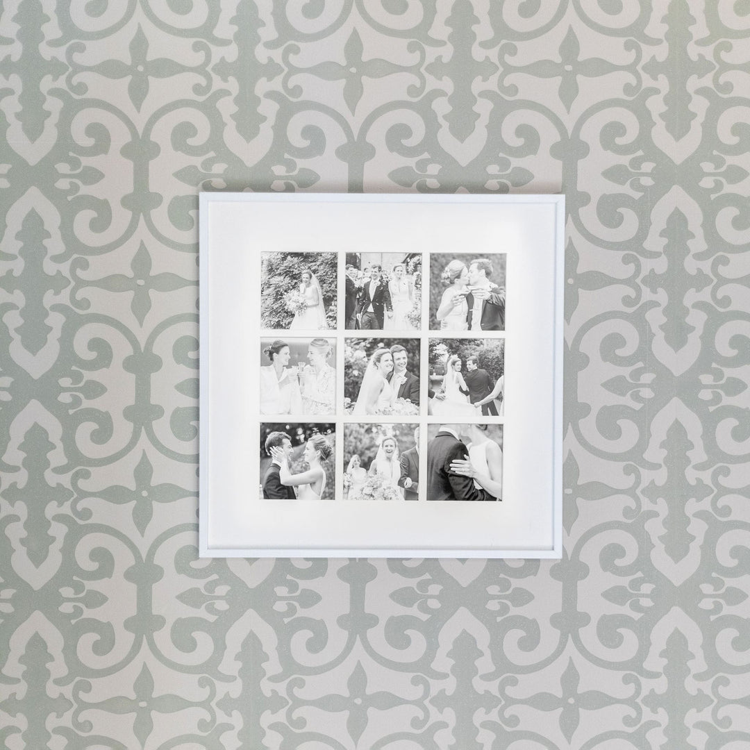 This White Aluminium Wall Mounted Square Frame also features a back stand for table top. Featuring a 9 aperture bevel – cut mount in soft white card suitable for nine 4″ x 4″ square photos.