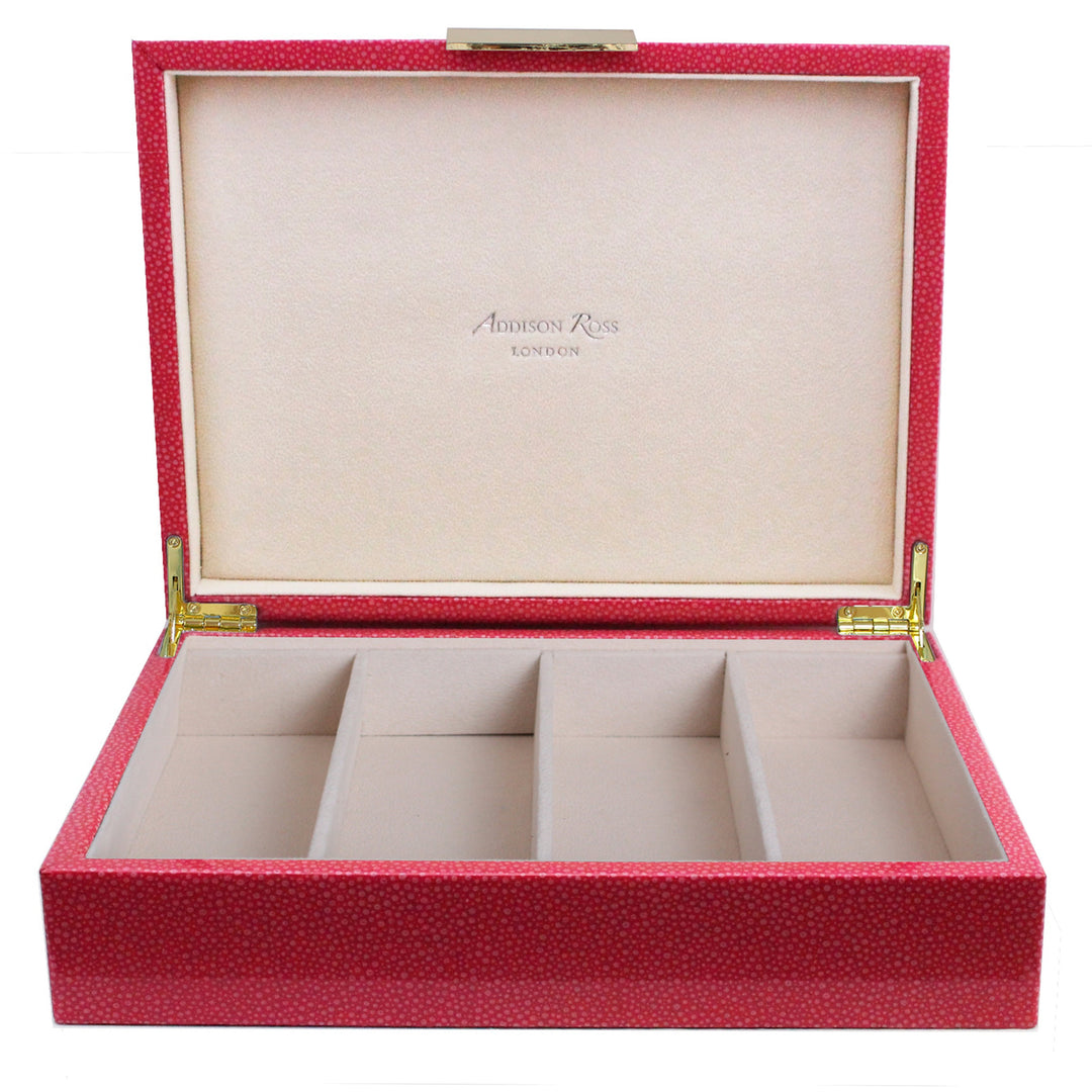 This lovely pink jewelry box boasts a polished shagreen finish and a bright gold clasp with matching hinges. With a luxuriously soft suede interior, this jewelry box is perfect for keeping precious items safely stored.