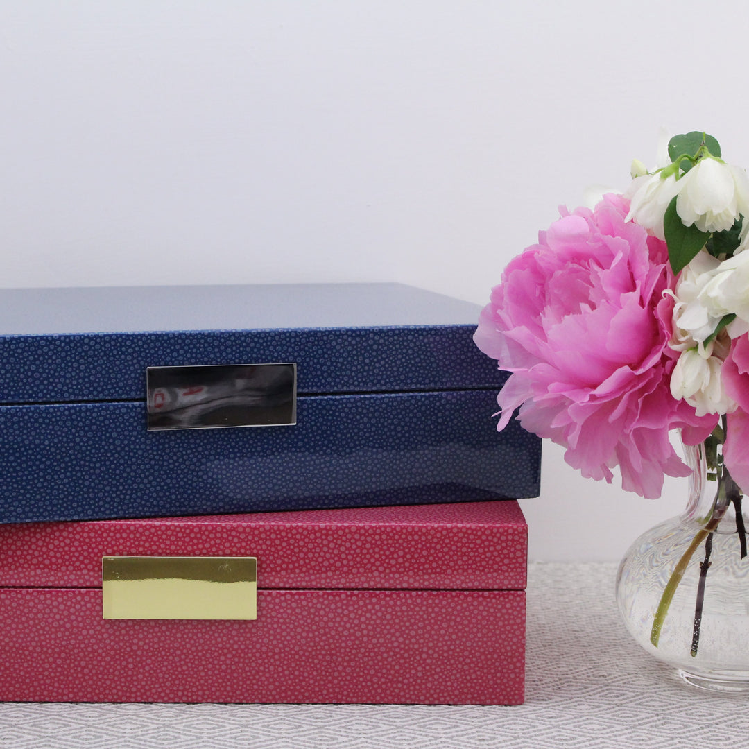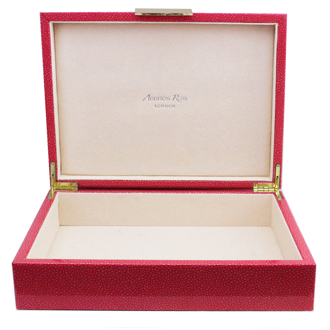 This beautiful pink storage box boasts a lustrous shagreen finish and a bright gold clasp with matching hinges. With a luxuriously soft suede interior, this piece is perfect for storing jewelry, watches, trinkets, and glasses.