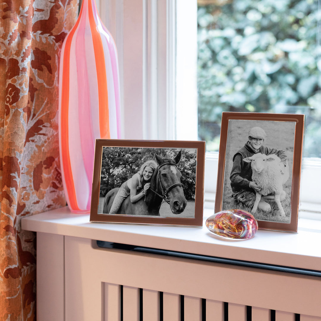 Pairing earthy terracotta tones with a classic silver trim this designer enamel picture frame will find a home on any shelf or side table. It’s neutral tone ensures your favorite photos have the spotlight they deserve.
