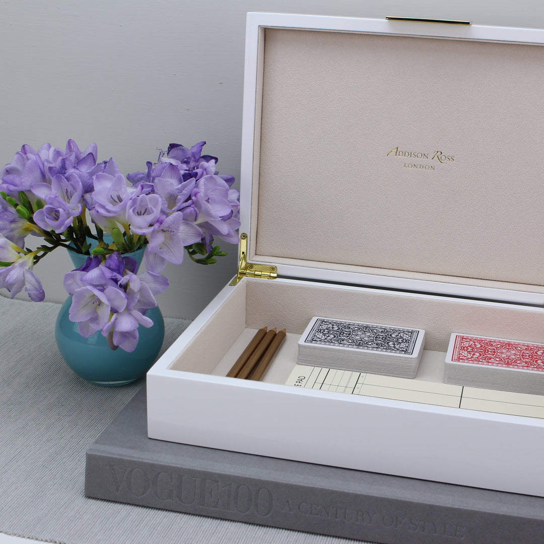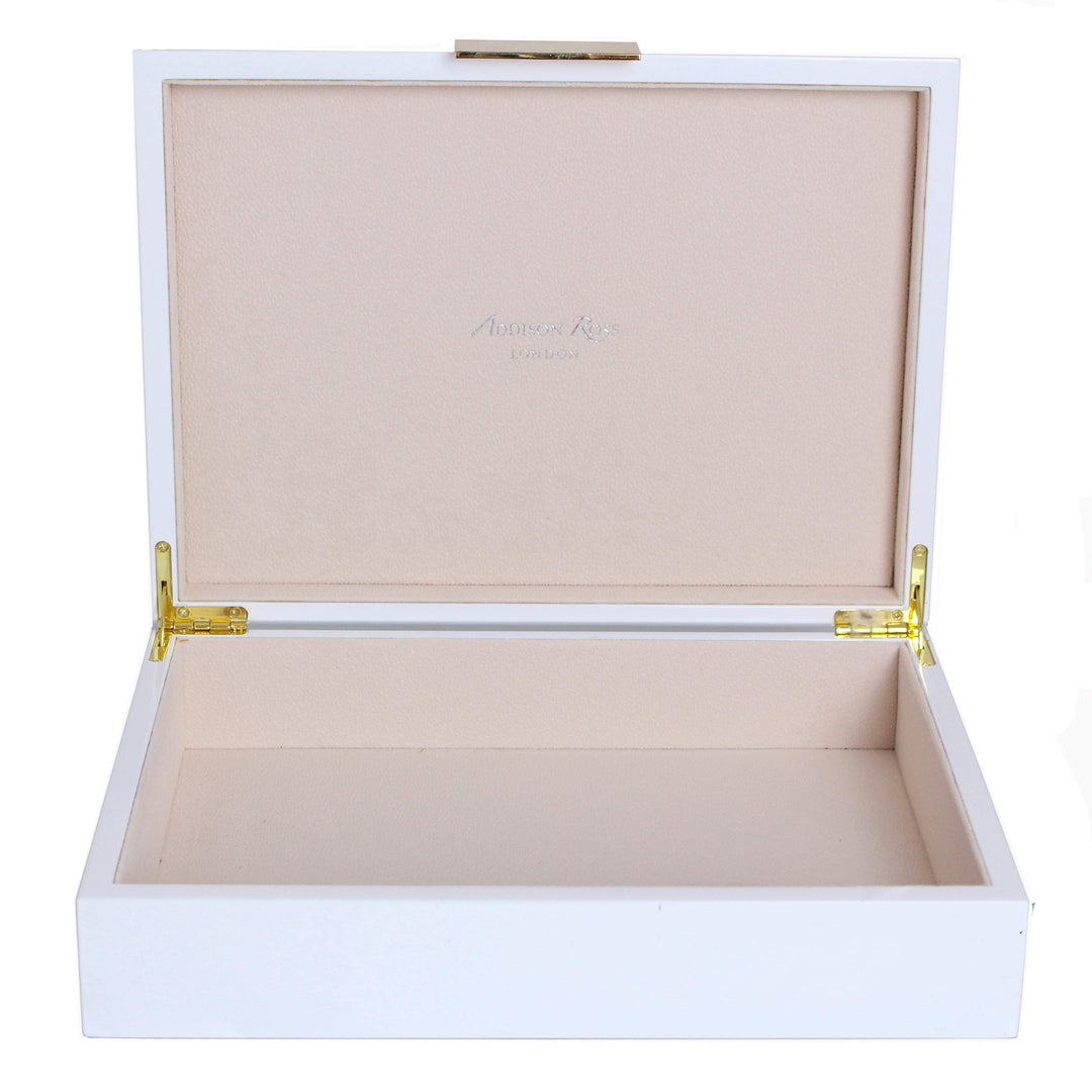 This stylish white storage box boasts a lustrous finish and a bright gold clasp with matching hinges. With a luxuriously soft suede interior, this piece is perfect for storing jewelry, watches, trinkets, and glasses.