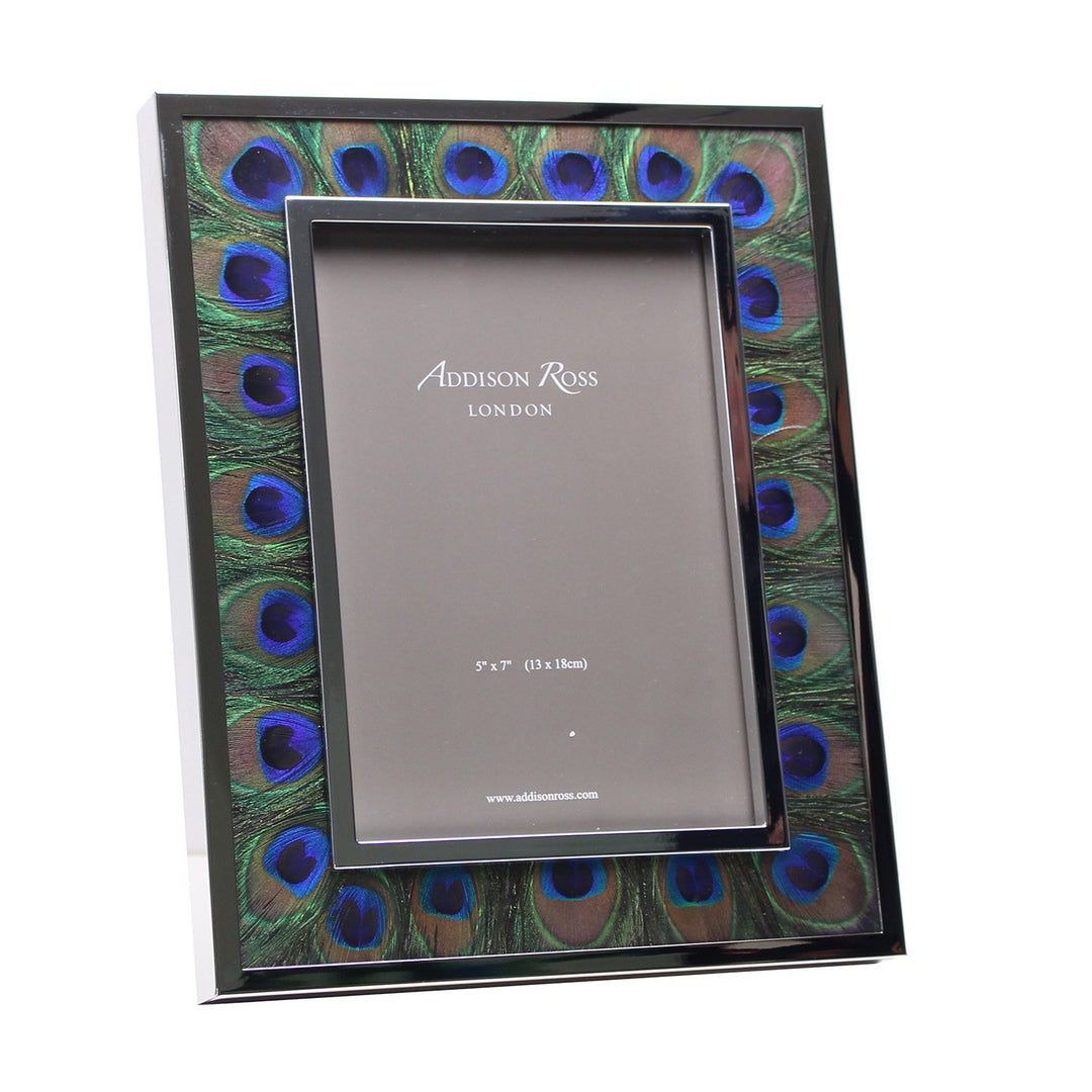 We have created this beautiful frame using natural peacock feathers encased in a silver plate frame. Able to stand landscape or portrait, this frame features a luxury dove grey velvet back.